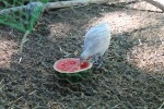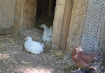 The baby chicks that came home at two-day’s old  in June are now safely ensconced in the barn, with nesting boxes and a big run with access to a chicken run outside with a door that gives them the barn yard to run free. We are lucky because out of the six chicks, we only acquired one rooster. He is a Black Copper Maran and his name is Satchmo. The girls are Mukluk, a Cochin, Lavender and Flower, Orpingtons, Brown Betty a Breda and Mumbo a Maran hen. They are all addicted to watermelon. The brown stain on Mukluk’s breast is watermelon juice!